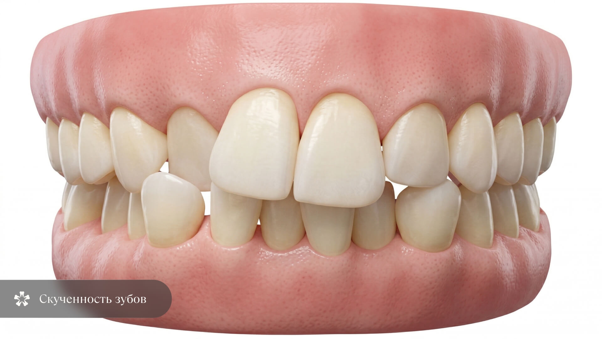 Скученность зубов — состояние, связанное с недостатком места в зубном ряду, из-за чего возникает тесное положение зубов. Это приводит к ухудшению гигиены полости рта, быстрому накоплению налета, повышению риска развития кариеса, гингивита и других воспалительных процессов. Со временем страдает прикус, а также равномерность перераспределения нагрузки при жевании, что отражается на работе всей зубочелюстной системы.