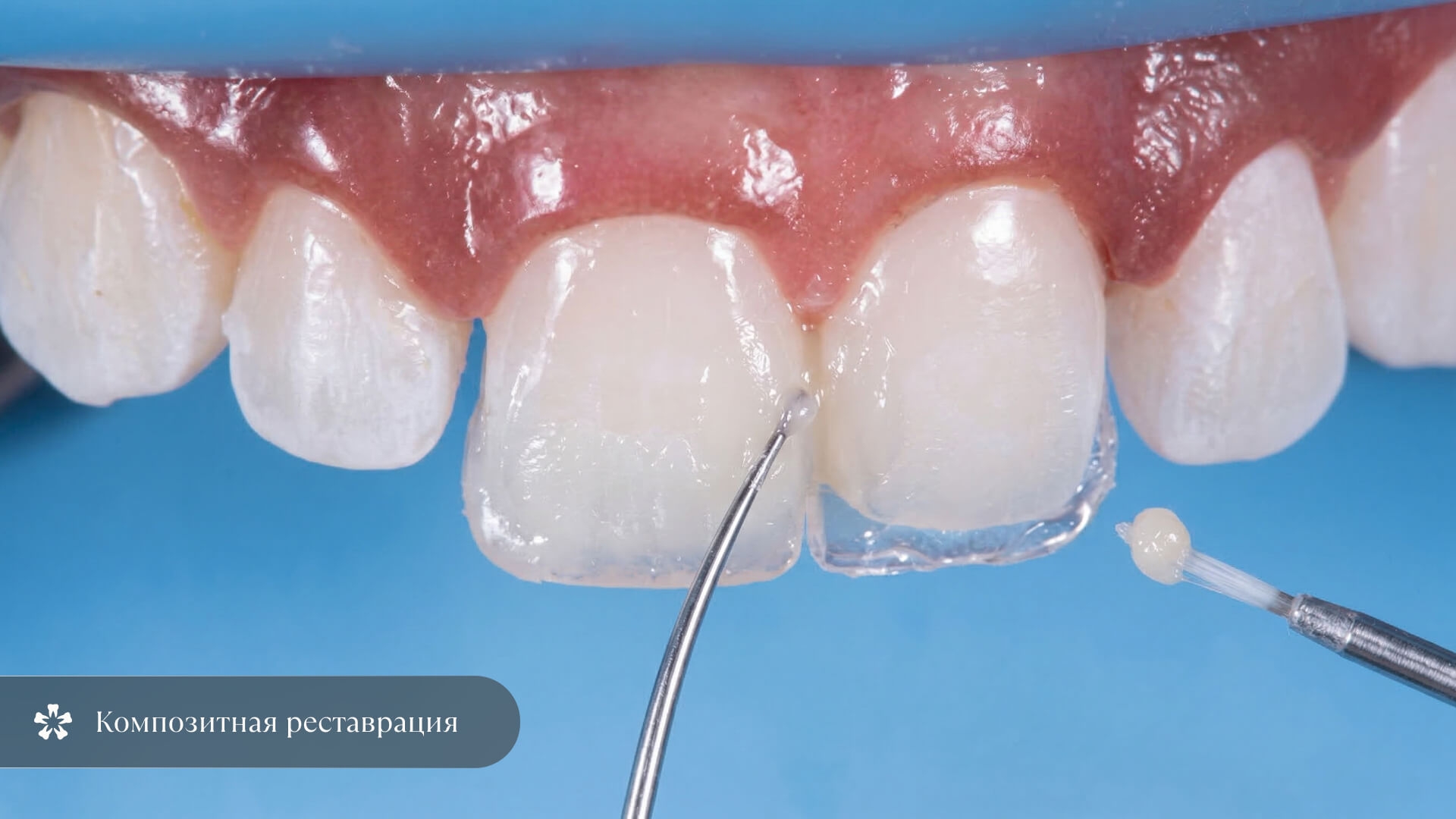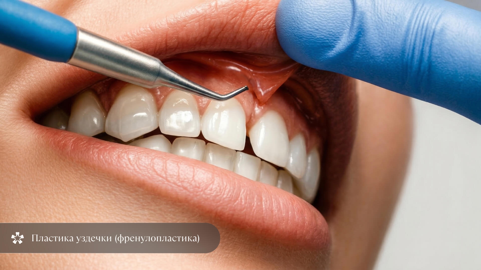 Уздечка верхней губы — это слизистый «тяж», который соединяет губу и десну. Когда она короткая или прикрепляется слишком низко (почти у межзубного сосочка), её волокна заходят в область между центральными резцами и создают там постоянное натяжение. В результате резцы как бы остаются разделенными: мягкие ткани тянут их в разные стороны и не дают краям сомкнуться даже при росте челюсти. Это одна из самых частых причин, по которой формируются стойкие промежутки между зубами.