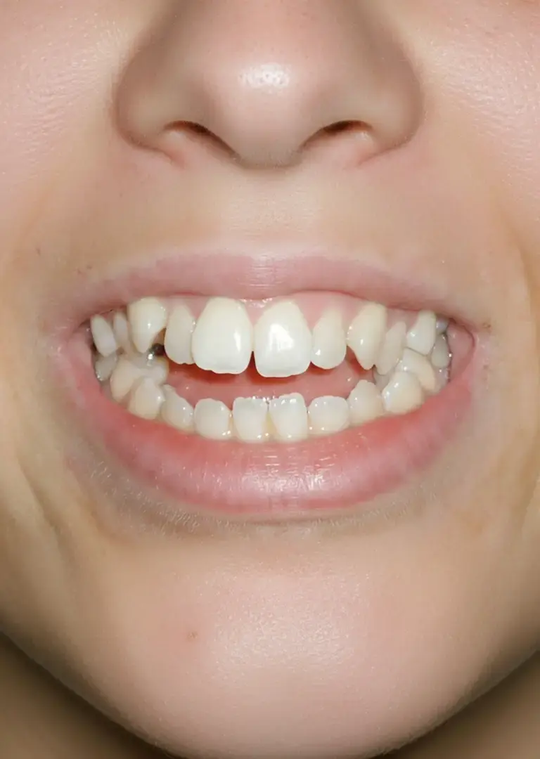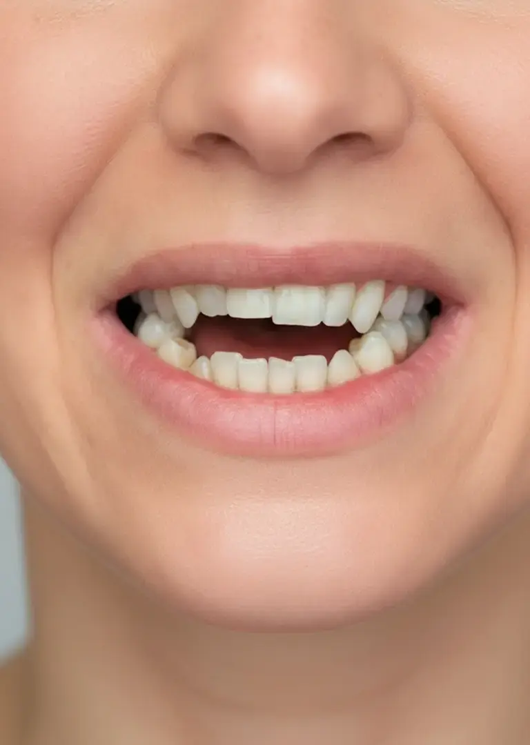 Симптомы: видимое расстояние ая щель между верхними и нижними зубами в переднем или боковом отделе; Нарушение функции откусывания и пережевывания пищи (особенно передними зубами); Проблемы с дикцией (шепелявость, нечеткое произношение звуков, особенно шипящих и свистящих); Напряжение лицевых мышц, удлинение нижней трети лица.